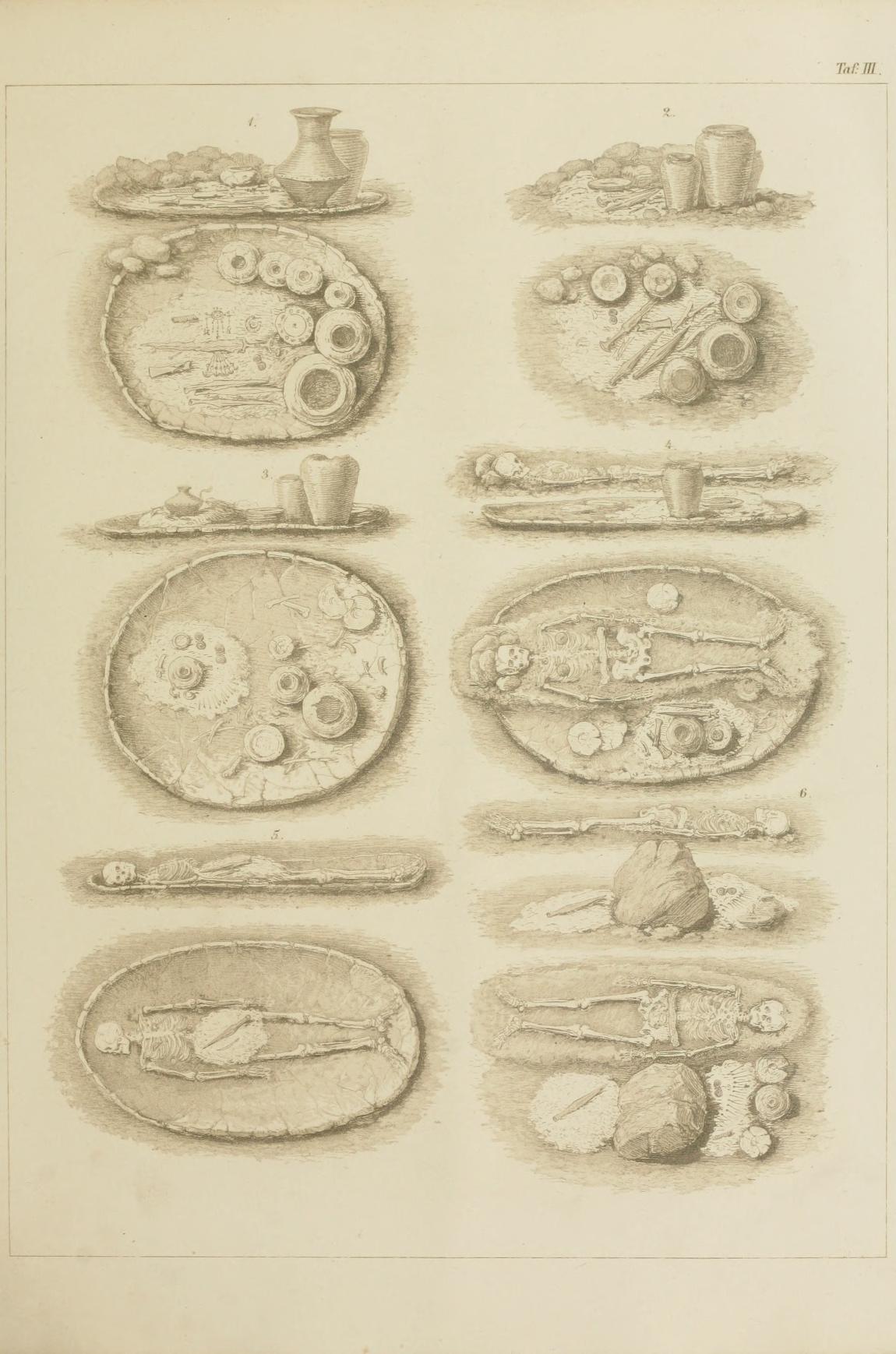 - Prancha ilustrada (Tafel III) contendo representações gráficas de sepultamentos escavados em Hallstatt, Áustria. A imagem mostra diferentes arranjos de esqueletos humanos e bens funerários como cerâmicas, objetos metálicos e orgânicos. As escavações foram conduzidas por Johann Georg Ramsauer, cujos registros gráficos documentam a disposição original dos túmulos.