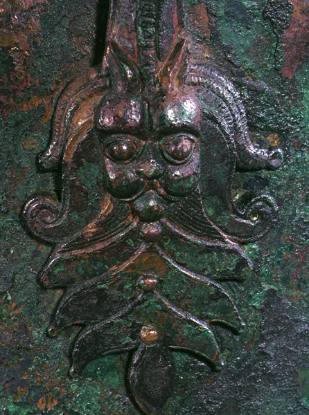 - Decoração aplicada à junta da alça da enócoa em bronze encontrada no enterramento de Kleinaspergle. Da decoração de folhagens (inspirada na decoração de vegetação das enócoas etruscas em bronze), surge a face de um homem barbado. Se a imagem for invertida, aparece outra face masculina onde a folhagem passa a representar os cabelos. Estilo lateniano inicial (LT A)