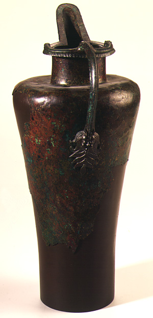 Reconstruída, a enócoa em bronze tem altura de 45.3 cm e diâmetro máximo de 11.5 cm na boca do vaso.
