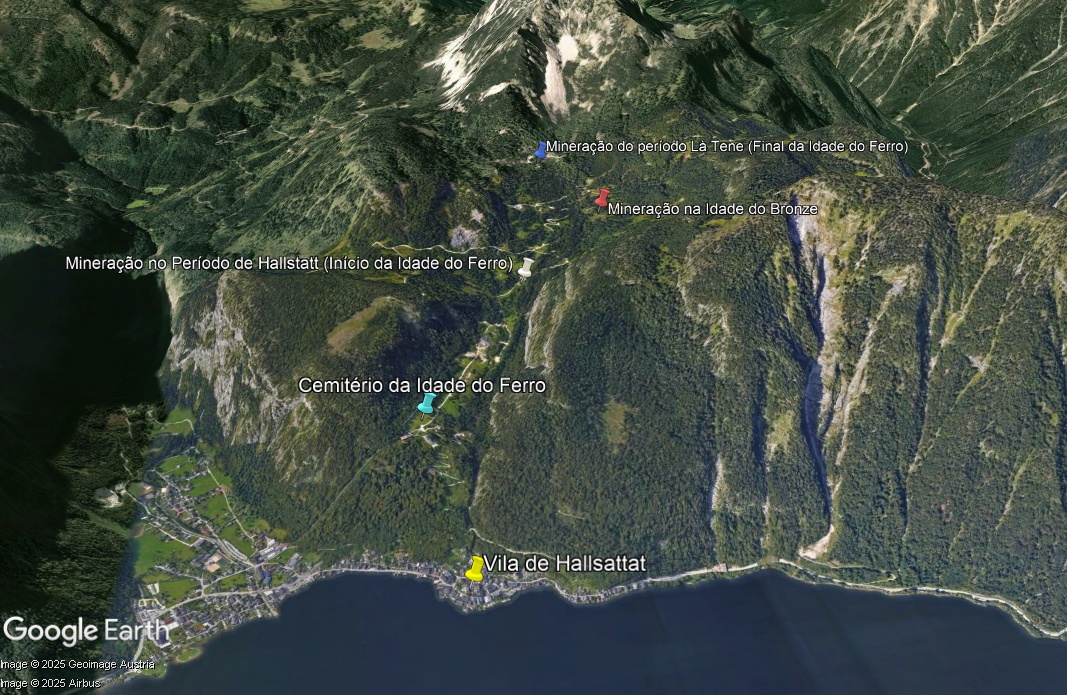 - Este é um mapa aéreo da região de Hallstatt, na Áustria, com destaques coloridos indicando os principais sítios arqueológicos identificados nas encostas montanhosas. As cores representam diferentes áreas de ocupação e uso ao longo de diversas épocas históricas, desde a Idade do Bronze e Idade do Ferro.