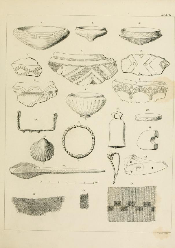 - Prancha ilustrada (Tafel XXVI) contendo desenhos técnicos de fragmentos cerâmicos decorados, adornos metálicos, conchas, peças têxteis e outros artefatos encontrados em sepultamentos da necrópole de Hallstatt. Esses objetos podem demonstrar práticas artísticas, tecnológicas e rituais da Idade do Ferro. Um dos destaques é a preservação de padrões têxteis e relevos decorativos em cerâmica.